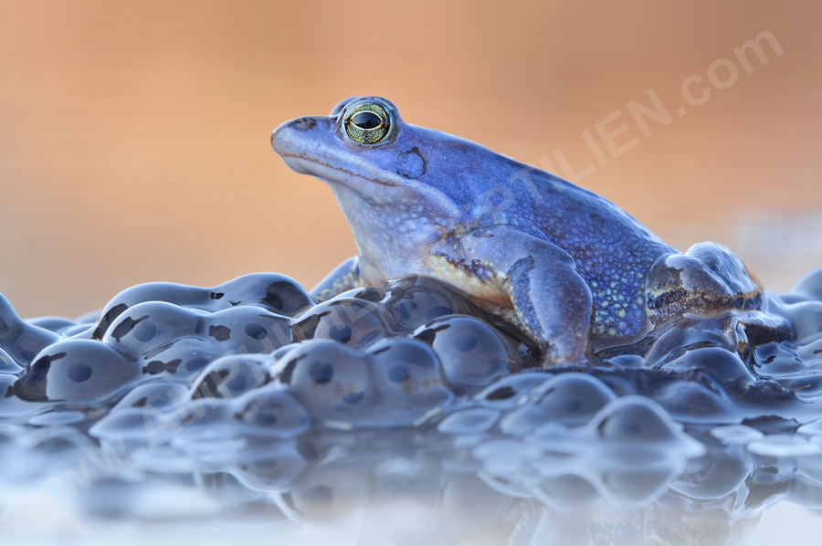 Moorfrosch (Rana arvalis) das blaue Männchen und braune Weibchen